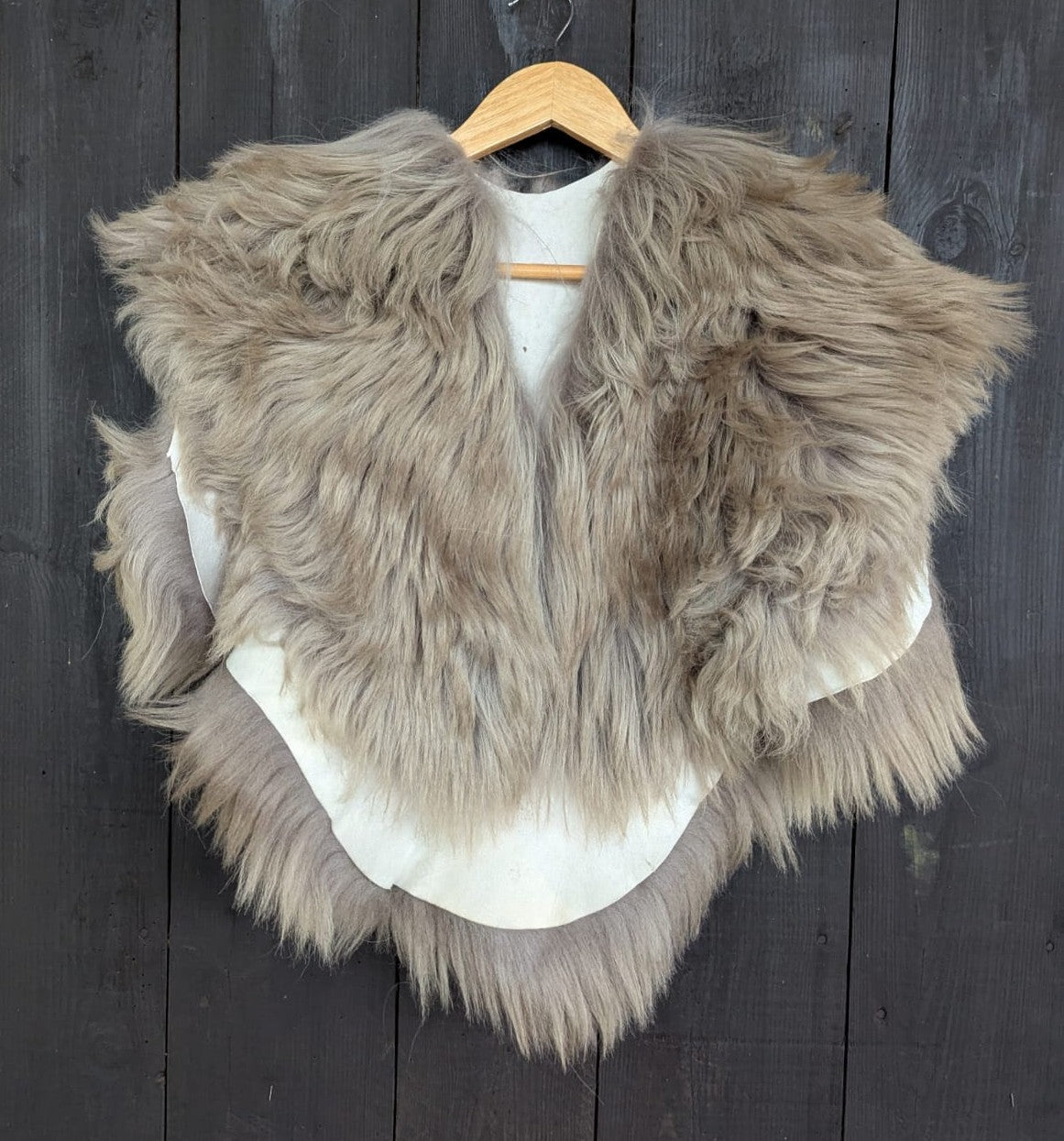 Schulterfell aus Schaffell (Islandschaf) – voluminös, weich und authentisch. Farbspiel Naturweiß/Creme mit warmen karamell- bis hellbraunen Strähnen. Ideal für Mittelalter, LARP, Cosplay & Halloween.
