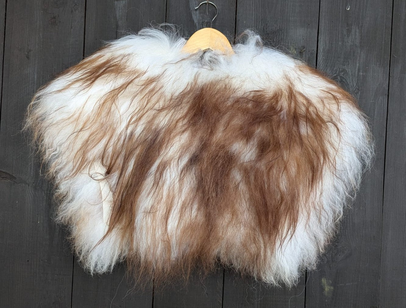 Schulterfell aus Islandschaf, langhaarig und voluminös. Farbspiel Naturweiß/Creme mit rotbraunen Strähnen, ideal für Mittelalter, LARP, Cosplay & Halloween.