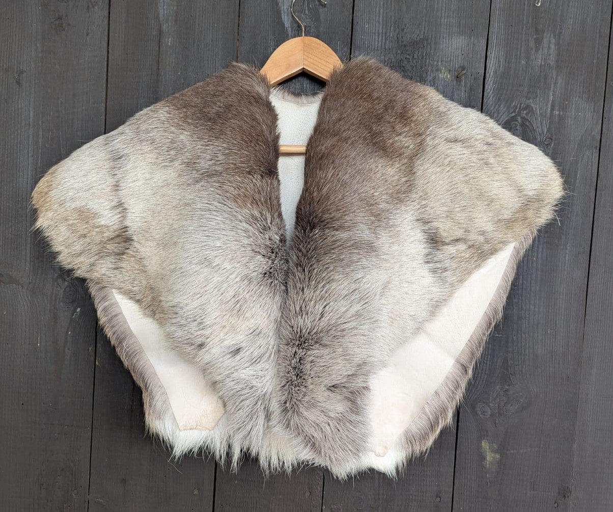 Schulterfell aus Rentierfell – edel, weich und sehr dicht. Naturfarben mit feinem Grau-Braun-Verlauf und hellen Creme/Weiß-Partien. Ideal für Mittelalter, LARP, Cosplay & Halloween.