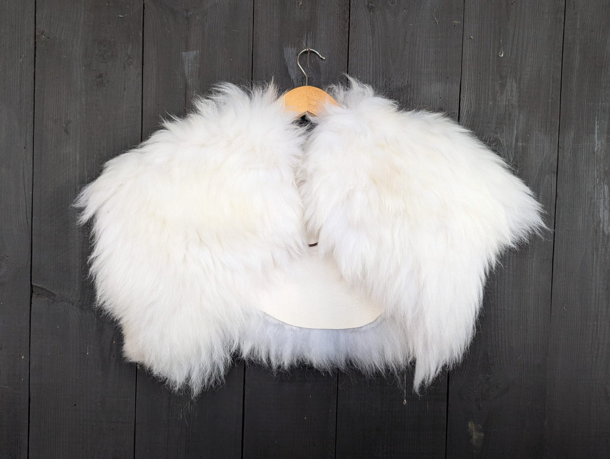Schulterfell aus Schaf in Reinweiß. Dicht, voluminös und weich – perfekt für Mittelalter, LARP, Cosplay & Karneval.
