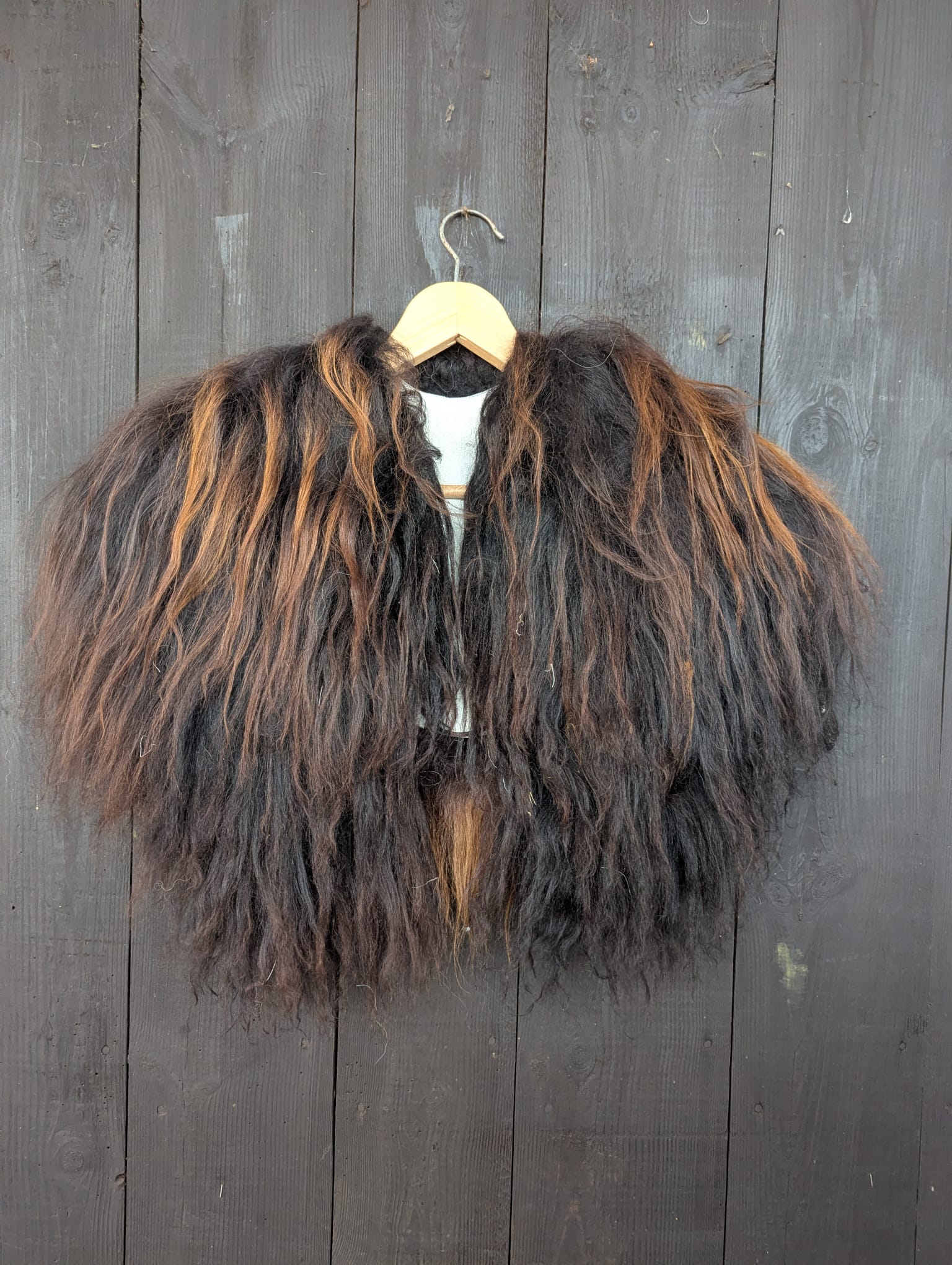 Schulterfell aus langhaarigem Islandschaf in Rotbraun (natürliche rotbraune/bernsteinfarbene Nuancen). Voluminös, weich und dicht – ideal für Mittelalter, LARP, Cosplay & Karneval.