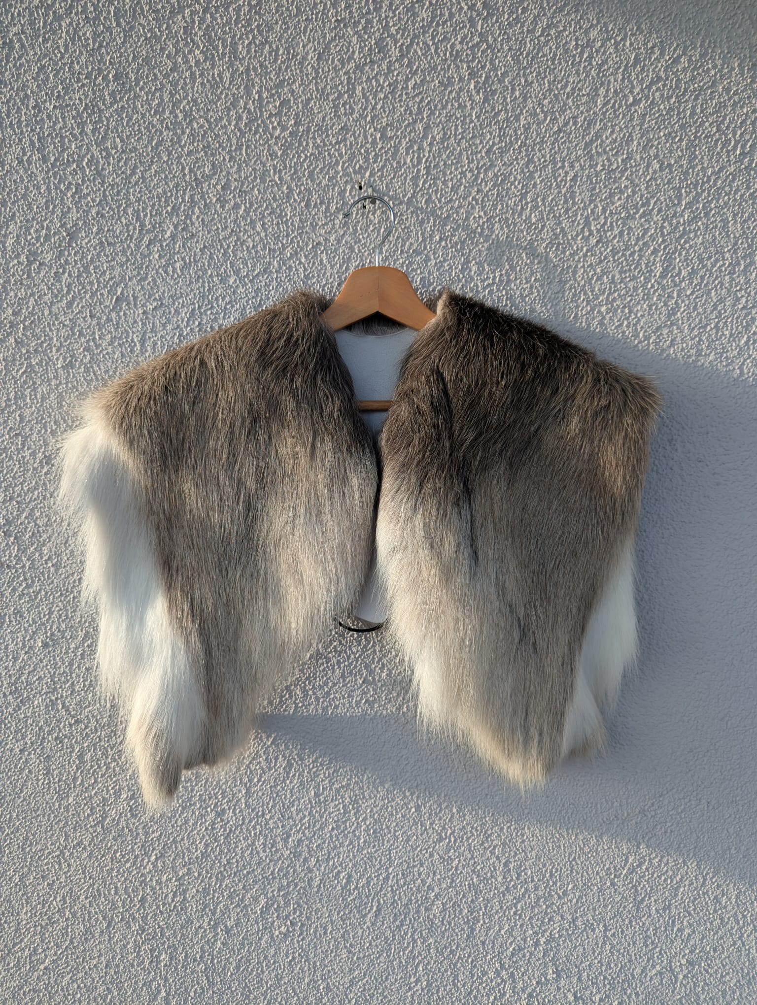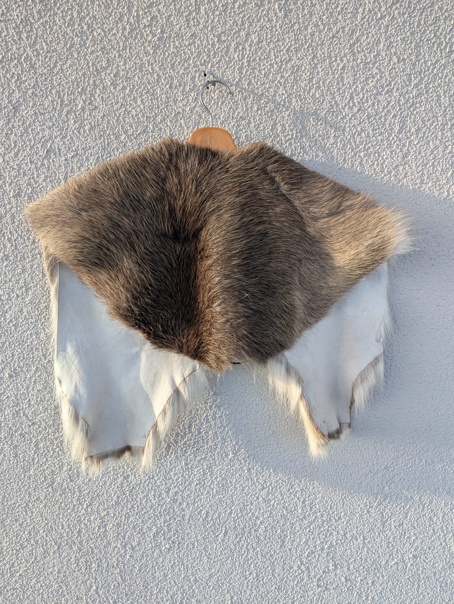 Dieses Schulterfell aus echtem Rentierfell besticht durch seinen natürlichen Farbverlauf von Grau- und Brauntönen hin zu hellen, fast weißen Partien.